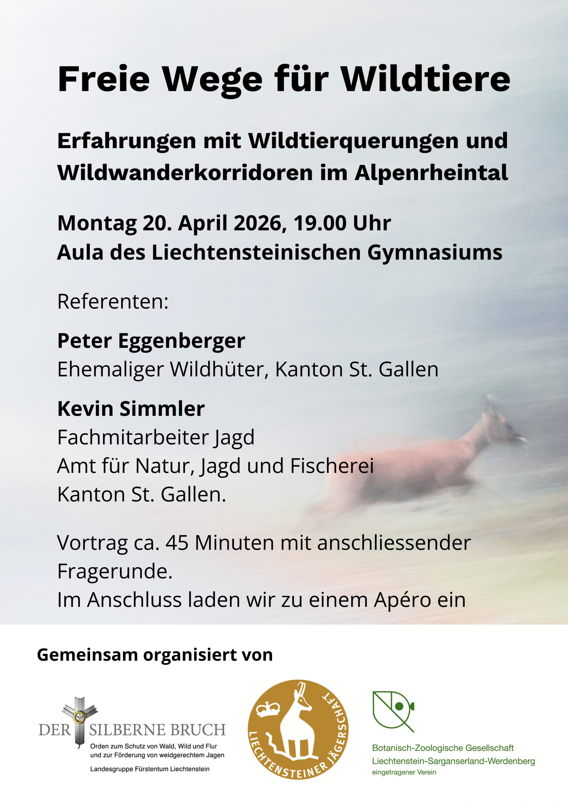 - Montag, 20. April 2026 – 19:00 Uhr: Freie Wege für Wildtiere – Erfahrungen mit Wildtierquerungen und Wildwanderkorridoren im Alpenrheintal